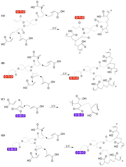 Proposed reaction mechanism under UV crosslinking conditions of acrylic acid in presence of (A) functionalized TiO2 nanoparticles (mode I), (B) functionalized TiO2 nanoparticles (mode II), (C) functionalized SiO2 nanoparticles (mode I), and (D) functionalized SiO2 nanoparticles (mode II).