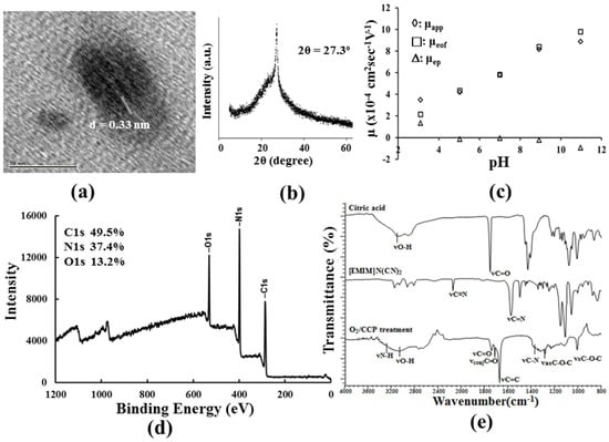 Characterization of the C-dots prepared in the conditions of Figure 1a. (a) HRTEM image; (b) XRD spectrum; (c) the plot of mobility with the pH of the running buffers; (d) XPS spectrum, and (e) FTIR spectrum.