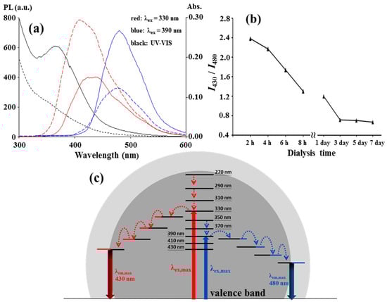 (a) Fluorescence and UV-Vis absorption spectra of the C-dots prepared in the conditions of Figure 1a before (solid lines) and after (dashed lines) dialysis in H2O by a 500–1000 Da cut-off membrane for two hours; (b) The plot of the PL intensity ratios of 430 nm PL intensity to 480 nm PL intensity with the dialysis duration; (c) The proposed PL mechanism.