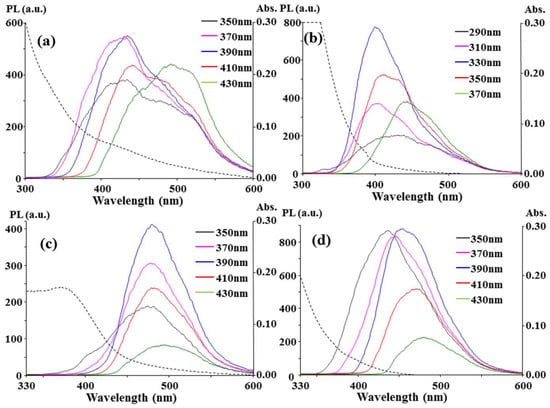 As shown in Table S1, the highest photoluminescence (PL) intensity (Imax) observed at the corresponding emission (λem,max) and excitation (λex,max) wavelengths varied with the acid and nitrogen-containing solvent used. Some of the solvents, including PEI 600, [BMIM]AlCl4, [BMIM]BF4, and [MOIM]Cl, possessed similar λem,max and λex,max values for all the acids, but other solvents did not. Most of the CCP products possessed an obvious dependence of λem on λex, but a few of them did not. Interestingly, the C-dots obtained from the O2/CCP treatment of CA and MA in [EMIM]N(CN)2 possessed the first and second highest photoluminescence (PL) intensities among the CCP products in Table S1, but their dependence of λem on λex was obscure. As shown in Figure 1a and Table S1, the emission redshifts were only 11 nm and 26 nm as an increase of 80 nm in λex was applied to the CA-based C-dots (350 nm to 430 nm) and MA-based C-dots (300 nm to 380 nm), respectively. In contrast, as shown in Figure 1(b), an obvious 58 nm redshift emission (λex = 350~430 nm) was observed for the O2/CCP of [EMIM]N(CN)2 alone. Moreover, the λem,max position and the smaller PL intensity in Figure 1b were different from those of the CA- and MA-based C-dots. There should be a synergistic effect of [EMIM]N(CN)2 and the acids, CA and MA, on the formation of fluorescent C-dots in the O2/CCP carbonization. Further discussion about the independence of λex for the CA-based C-dots is addressed in Section 3.2.