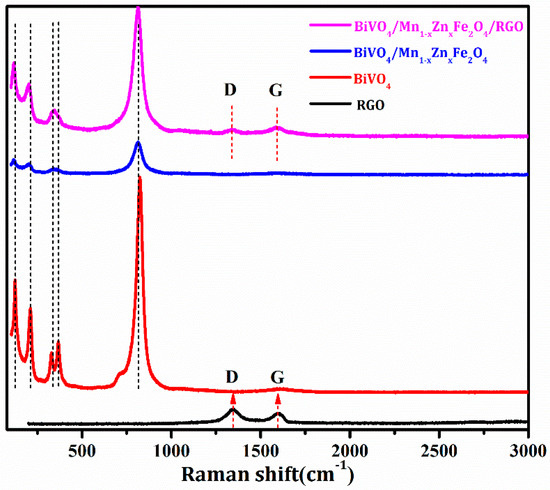 Raman spectra of RGO, BiVO4, Mn1−xZnxFe2O4/BiVO4, and Mn1−xZnxFe2O4/BiVO4/RGO.
