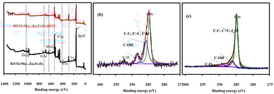 To investigate the valence state and the surface property of BiVO4/Mn1−xZnxFe2O4/RGO, XPS spectrum characterization was employed. As displayed in Figure 3a, the spectrum intensity of C 1s in BiVO4/Mn1−xZnxFe2O4/RGO was larger than that in BiVO4/Mn1−xZnxFe2O4, namely, the introduction of RGO brought the intensity increase of C 1s. The spectrum intensity of oxygen-containing functional groups in Figure 3b was larger than that in Figure 3c, meaning the decrease of GO and the increase of RGO in BiVO4/Mn1−xZnxFe2O4/RGO sample. This feature confirmed the efficient reduction of GO and the valence states for various elements in BiVO4/Mn1−xZnxFe2O4/RGO.