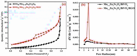 Specific surface area of the as-obtained compounds was determined with the adsorption instrument, and the result was shown in Figure 5. The adsorption–desorption isotherms in Figure 5 were the typical isotherm III, agreeing with the reference report [26]. The discrete curve of BiVO4/Mn1−xZnxFe2O4/RGO was in p/p0 range of 0.45–0.55, and the pore diameter distribution was mainly 2–10 nm, and the most probable distribution was located in 4 nm. It was deduced that the introduction of RGO caused the mesopore increase and the macropore decrease. Thus, there was the uniform surface structure in the ternary composite. Calculating with the data in Figure 6, the specific surface area of BiVO4/Mn1−xZnxFe2O4/RGO was 8.84 m2/g, and that of BiVO4/Mn1−xZnxFe2O4 was only 2.22 m2/g. The incorporation of RGO enhanced the specific surface area compared with BiVO4/Mn1−xZnxFe2O4. The larger specific surface area provided more active surface sites, more free space to improve the mobility of photo-induced electrons, and further facilitated the effective migration of charge carriers, leading to the remarkable improvement of photocatalytic performance [27]. The surface structure characterization could demonstrate, in advance, the photocatalytic activity of BiVO4/Mn1−xZnxFe2O4/RGO to some extent.