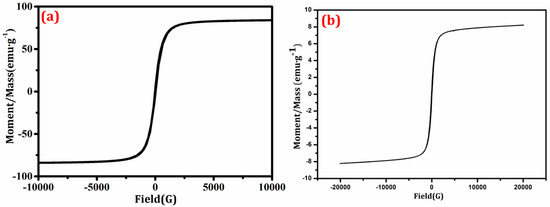 The magnetic hysteresis loops of the samples were displayed in Figure 6. The saturation magnetization (Ms) of Mn1−xZnxFe2O4 and BiVO4/Mn1−xZnxFe2O4/RGO were 84.03 and 8.21 emu g−1, respectively. Ms of the compounds was lower than that of the pure Mn1−xZnxFe2O4, owing to the amount decrease of the magnetic substance quantity in per unit composite. It was obvious that the prepared composite BiVO4/Mn1−xZnxFe2O4/RGO had a soft-magnetic feature like pure Mn1−xZnxFe2O4, which further confirmed than the synthesized composite must be comprised of Mn1−xZnxFe2O4 component [20,26].