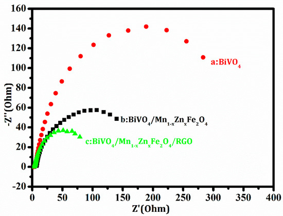 Electrochemical impedance spectroscopy (EIS) was an effective approach to evaluate electron transfer ability in the interface between solid phase electrodes and electrolyte solution [28]. The typical impedance spectra of the samples were displayed with Nyquist plots. The semicircle diameter in Figure 8 became small when RGO inserted in the work electrode contained the compound. This change implied the resistance decrease and the conductivity increase in the test interface. The charge-transfer resistance (Rct) of the samples was gained by fitting the data from Figure 8. Rct of BiVO4, BiVO4/Mn1−xZnxFe2O4, and BiVO4/Mn1−xZnxFe2O4/RGO were 351.0 Ω cm2, 206.0 Ω cm2, and 103.0 Ω cm2, respectively. It was clear that Rct of the ternary composite was the lowest.