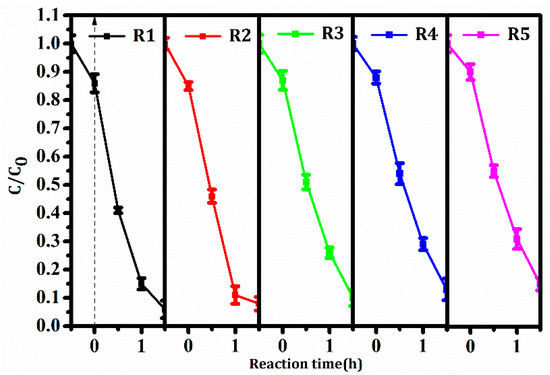The stability was a key property in the industrial application of catalytic materials. Each recycling experiment was operated in triplicate, and average values and standard deviations were also shown in Figure 10. The degradation ratio of RhB in the fifth recycling was still 85.0% after 1.5 h of reaction under the same test parameters. The photocatalytic activity was only reduced a little within five recycles. The result revealed good stability of BiVO4/Mn1−xZnxFe2O4/RGO.