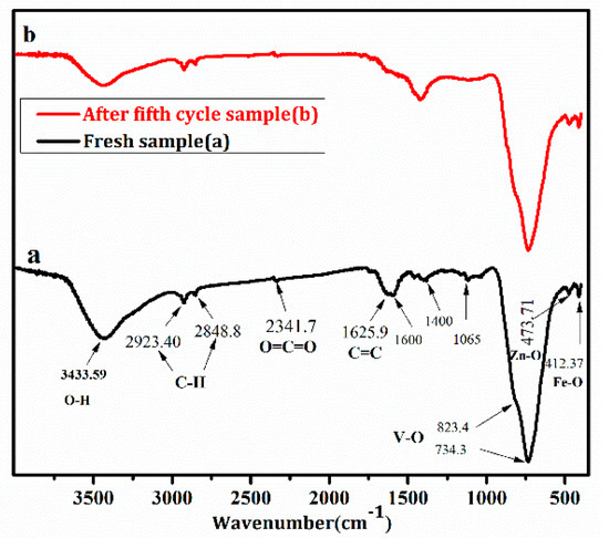 FTIR spectra of Mn1−xZnxFe2O4/BiVO4/RGO (a) the fresh sample; (b) the recovered sample.