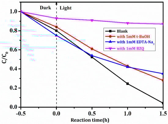 The photocatalytic mechanism of BiVO4/Mn1−xZnxFe2O4/RGO was probed with radical scavengers [31]. t-BuOH (•OH scavenger), EDTA-Na2 (h+ scavenger), and BZQ (•O2− scavenger) were employed to ascertain the dominant radical species in the photocatalytic degradation of RhB with the as-synthesized compound. Degradation ratios of RhB under these scavengers were given in Figure 12. The photodegradation ratio of RhB was 72.0% and 65.0% only when 5.0 mM t-BuOH and 1.0 mM EDTA-Na2 were added into the reaction system. Namely, h+ or •OH scavenger brought about the decrease of degradation ratios. Thus, the photocatalytic activity of the compound greatly decreased. The inactivation of the photocatalytic test was evidently proven when 1 mM BZQ was added in the same reaction system. The above results demonstrated that the most active species was •O2−, though •OH and h+ also contributed to the photocatalytic activity of BiVO4/Mn1−xZnxFe2O4/RGO.