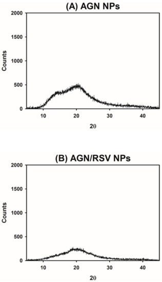 The solid states of developed AGN-based NPs were investigated by XRD test (Figure 2). The crystalline state of AGN Ex was already demonstrated in the previous study [27]. In contrast, sharp peaks are rarely shown in the profile of AGN NPs group, indicating their amorphous state (Figure 2A). The crystalline to amorphous transition of AGN components seemed to occur during the emulsification and solvent evaporation processes. The crystalline property of RSV was already revealed in our previous report [32]. However, it was altered to the amorphous state after its loading into the AGN NPs, as shown in the profile of AGN/RSV NPs (Figure 2B). As presented in the result of AGN Ex, the fabrication process might influence its amorphization. The amorphization of drug cargos, during the preparation process of injection nanoformulations, was also reported [32,38,39]. The interactions between AGN Ex and RSV may play major roles in their loading into the NPs and their sustained release from NPs.