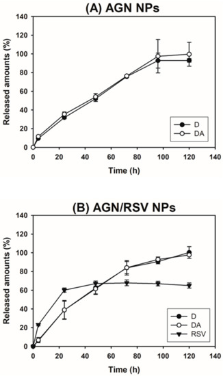 The release data of AGN NPs (D and DA) and AGN/RSV NPs (D, DA, and RSV). The cumulative released amounts of D, DA, and RSV from (A) AGN NPs and (B) AGN/RSV NPs are plotted. Data are shown as the mean ± SD (n = 3).