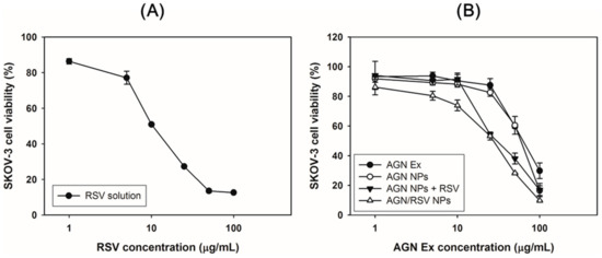 The antiproliferation data of RSV, AGN Ex, AGN NPs, AGN NPs + RSV, and AGN/RSV NPs in SKOV-3 cells. The cell viabilities according to RSV concentration (A) and AGN Ex concentration (B) are presented. The data are presented as the mean ± SD (n = 3).