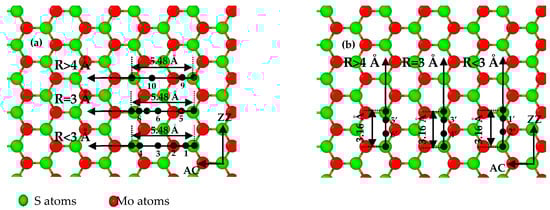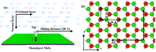 The MD simulations were conducted by using a large-scale atomic/molecular massively parallel simulator (LAMMPs) (Albuquerque, NM, US) []. The interaction between carbon atoms in the diamond probe is described with the adaptive intermolecular reactive empirical bond-order (AIREBO) (Clemson, SC, US) potential which has been used to predict the mechanical properties of carbon structures in previous studies []. The atomic interactions between the SLMoS2 and the diamond probe are described by using the Lennard–Jones potential (Leigh, Lancashire, UK), which has been verified in our previous work []. The atomic interactions in SLMoS2 are described with reactive empirical bond-order (REBO) (Raleigh, NC, US) potentials, which have been demonstrated to be accurate when describing the mechanical properties of SLMoS2 []. Before the sliding process, the system was relaxed by energy minimization using the conjugated-gradient method and the time step was set to 1 fs. A schematic diagram of the sliding on SLMoS2 is shown in Figure 1a. Conical probes with various tip curvature radii of 1, 2, 3, 4, 5, 6, 7, 8, 9 and 10 Å (total atoms of 36, 291, 884, 2150, 4288, 7515, 12,021, 18,071, 25,846 and 34,302 respectively) were generated to study the effect of tip radius on the frictional properties of SLMoS2 film, and the sliding rate was set to 0.2 Å/ps. All the simulations were thermostated at 0.1 K.