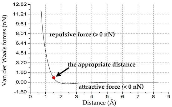 The distance between the lowermost atoms of the tip and the uppermost layer of S atoms should be in an appropriate range for the following reasons: (1) If the distance is too large, the repulsive force of the tip-MoS2 interaction could be so weak that it may be significantly affected by thermal fluctuations; and (2) if the distance is too small, the uppermost atoms of MoS2 may collapse during the sliding process due to the large repulsive force. For instance, we performed an MD simulation of the nanoindentation on a SLMoS2, and the tip radius was set to 1 Å. We chose a reasonable tip–sample distance of 1.47 Å, which allows the tip to reach the near-contact region where the Pauli repulsion governs the tip-MoS2 interaction [], and ensures that the tip is not very close to the uppermost MoS2 atoms. The van der Waals force–distance curve of the nanoindentation is shown in Figure 2. Besides, we also investigated the effect of tip–sample distance on the frictional properties with five vertical distances (1.27, 1.47, 1.67, 2.27, and 2.67 Å) and three different tip radii (1, 3, and 7 Å). The tip moves along the armchair (AC) and zigzag (ZZ) orientations. The lattice constants of the SLMoS2 and sliding paths are shown in Figure 1b.