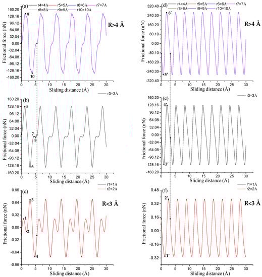 All frictional force–sliding distance curves show typical stick–slip motions in atomic frictions (see Figure 3). The frictional forces exhibit sawtooth waves with the periodicity (i.e., adjacent spacings of peak frictional forces) of the MoS2 lattice. The periodicities of both sliding paths are capable of characterizing the lattice constants of SLMoS2 []. The periodicities for each sliding path are almost constant for all tips with radii of 1 to 10 Å, which is equal to ~5.48 Å (Figure 3a–c) for the AC orientation and 3.16 Å (Figure 3d–f) for the ZZ orientation. Moreover, sub-nanoscale stick–slip movements occur in one-lattice sliding periods along with only the AC direction and only when the tip radius is smaller than 3 Å (see the points of 1 to 4 in Figure 3c). Herein, the sub-nanoscale stick-slip behavior for SLMoS2 is obviously different to that for graphene [], where sub-nanoscale stick and slip motions are found in the sliding along both the AC and ZZ directions.