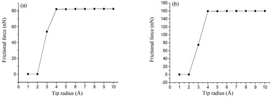 Among the large family of scanning-probe microscopy techniques, lateral-force microscopy (LFM) is an effective tool to study the atomic-scale frictional behaviors of two-dimensional (2D) materials. LFM can be used to image insulating and conducting surfaces with atomic resolution, and record tip–sample force interactions with ultrahigh precision. This ability allows for atom-specific-force mapping with piconewton and picometer resolution [,]. Because experimental LFM measurements are affected by interatomic interactions between the probe tip and the sample surface [], the tip features, including its stiffness [], asymmetry [,], apex structure [,], and chemical identity [,], are important in lateral-force imaging of surfaces and the characterization of frictional behaviors at the atomic scale. In general, scanning-probe microscopy/LFM measurements are thought to be more accurate with a sharper tip [,]. Therefore, the effect of tip radius on the frictional properties has been usually ignored in previous studies. Besides, for the various component forces exerted by sample atoms on the tip such as Van der Waals (dispersion), Coulomb (electrostatic), dipole, and atomic forces, and the shapes of the force curves differing markedly [], it is difficult to measure the tip–sample distance in the LFM experiments using only the LFM force curves. This approach has resulted in a lack of related studies on the effect of tip–sample distance on frictional properties. Hence, related parameters in the continuum mechanical model (for instance, Prandtl–Tomlinson model) of atomic-scale friction, such as the initial value of the tip–sample interaction, are usually set to empirical values [,,]. To the best of our knowledge, no work exists that correlates the detailed tip radius with the tip–sample distance as a function of the frictional properties of the 2D materials.