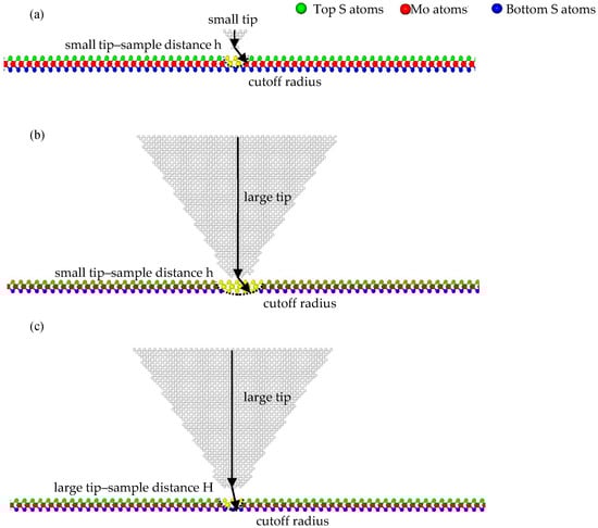 There is one viewpoint [] that the sub-nanoscale stick-slip motions stem from the 2D scanning path and depend on the lattice orientation of the substrate, which can be explained by the 2D Prandtl–Tomlinson model. They found that moving trajectories of the tip in the AC and ZZ orientations are the main reason for the differences in details (the number of extreme points and the wave shape) of the frictional force–sliding distance curves of LFM tips on SLMoS2. In addition, some unexpected sub-nanoscale stick-slip motions usually occur in the curves during the LFM experiments because the tip stiffness is so small (0.02 N/m), and the movement of the tip is affected by the load []. However, our simulation results show that 2D scanning paths are not necessarily required for the sub-nanoscale stick-slip motion, under the condition that the smaller tip radii are employed when the tip-substrate distance is specified. We attribute its underlying mechanism to the number of interactive atoms, as illustrated in Figure 6. The larger tips contain more carbon atoms than the smaller tips, when the cutoff for carbon atoms in the Lennard–Jones potential is constant. Therefore, the influence of the van der Waals force of the larger tip is larger than that of the small tip. In other words, the small tip is more susceptible to the interactive forces of surrounding atoms of SLMoS2 during the sliding process; however, the influence of interactive forces for the larger tip is not so remarkable, as shown in Figure 6a,b. Logically possible, large tips (3 to 10 Å) can provide the comparative detailed and higher-precision frictional properties (e.g., sub-nanoscale stick slip motions) of SLMoS2 when reducing the interactive atom number by increasing the tip–sample distance, as shown in Figure 6c.