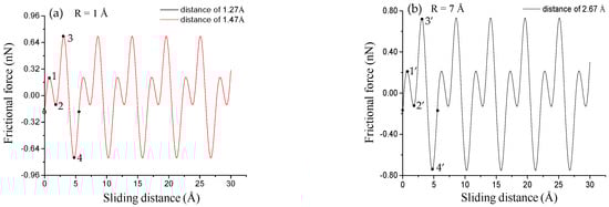 Frictional force–sliding distance curves for various vertical distances (1.27, 1.47 and 2.67 Å) between the tip and SLMoS2 film for sliding paths along the AC orientation. The tip radii of 1 Å, and 7 Å are for (a) and (b), respectively. All the frictional force–sliding distance curves for various vertical distances (1.27, 1.47, 1.67, 2.27, and 2.67 Å) between the tip and SLMoS2 film for sliding paths along the AC orientation and ZZ orientation are shown in Figure S1 (Supplementary Materials).