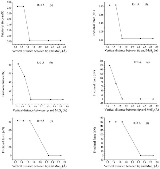 We conducted MD simulations of the atomic-scale friction of a typical 2D single-layer molybdenum disulfide (SLMoS2), which has been widely used in the applications of optoelectronics and electronics [,,] due to its unique photoelectric and mechanical properties. The effects of tip radius and vertical tip–sample distance on the frictional properties were analyzed and discussed. Ours is the first study that indicates that the characterization of atomic-scale frictional properties depends on a coupling of tip radius and tip–sample distance, and the study presents novel insight into LFM nanomanipulation when studying the atomic-scale frictional behaviors of 2D materials.