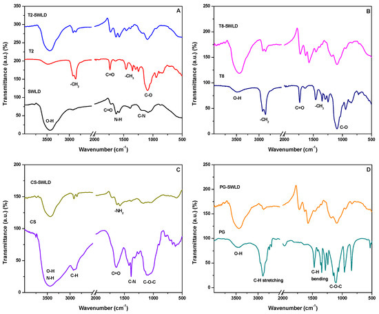FTIR spectra of: SWLD, T2, T2-SWLD in (A); T8, T8-SWLD in (B); CS, CS-SWLD in (C) and PG, PG-SWLD in (D).