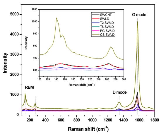 Based on Figure 2, the characteristic features of the graphitic layers in SWCNT were found in the region of 1346 cm−1 (disorder-induced D mode) and 1579 cm−1 (tangential G mode). The G mode refers to the main vibrational stretching of the graphene in two-dimensional hexagonal lattices, whereas D mode is correlated with the existence of structural defects. These two essential modes of the SWCNT were also detected in the Raman spectra of all coated conjugates and the data are summarized in Table 2. In addition, another important peak, the radial breathing mode (RBM), was seen in the range of 100–300 cm−1 for all nanotubes samples, indicating that the structure of the nanotubes has not changed after drug loading and coating process. This important phonon mode in Raman spectra provides information on the nanotubes geometrical parameters and its frequency is inversely proportional to the diameter of a CNT [42]. It is interesting to note that only CS-SWLD conjugate presented the highest Raman intensity with a sharp narrow G mode of all the studied samples. This could be correlated with the changes in orientation effect due to the crystalline supramolecular structure of the CS polymer during the coating treatment [43].