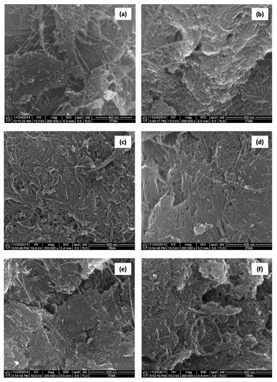 FESEM surface morphologies of: (a) carboxylated SWCNT; (b) SWLD; (c) T2-SWLD; (d) T8-SWLD; (e) CS-SWLD; and (f) PG-SWLD conjugates at magnification of 200,000×.