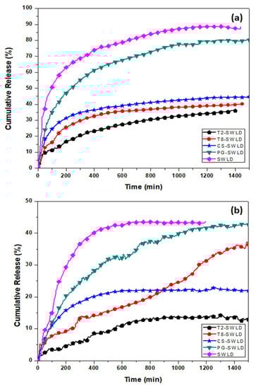 At pH 7.4, LD was released at a slow and sustained manner from SWLD, T2-SWLD, T8-SWLD, CS-SWLD and PG-SWLD, to the extent of around 89%, 36%, 40%, 45% and 80%, respectively, after 1500 min (Figure 4a). On the other hand, a faster but lower amount of LD was released at pH 4.8 from SWLD (~44%), T2-SWLD (~13%), T8-SWLD (~36%), CS-SWLD (~22%) and PG-SWLD (~43%) until a plateau was reached at approximately 600 min (Figure 4b). The rapid release of LD into pH 4.8 at the initial stage could be affected by the acidity of the medium which leads to partial dissolution of the polymers. Overall, the release rate of LD at pH 7.4 was found to be remarkably higher than that at pH 4.8, suggesting that the release mechanism of LD is pH-triggered. In the neutral environment (pH 7.4), the hydrophilic groups of –COOH will facilitate the release of LD as the polymer swelled in the medium. However, the hydrophilic –COOH changed to hydrophobic when exposed to acidic environment (pH 4.8), and tended to form aggregates, possibly by electrostatic interactions [47], hindering the release of LD into the acidic medium.
