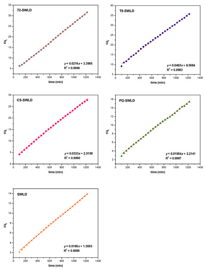 Five mathematical kinetic models were compared with the aid of equations presented in Table 3 and the correlation coefficient values (R2) obtained using these models are also summarized in Table 3. Based on the release kinetics data and the R2 values, the release profiles of LD were found to govern by the pseudo-second order (R2 = 0.9983–0.9996). This could be attributed to the dissolution kinetics of ions exchanged between the surface-coated SWLD and the anions in the release medium [56]. The model is usually characterized by its linear form, as demonstrated in Figure 5. The rate-controlling step in the drug release process could be due to chemisorption, where the exchange of electrons occurs between the polymer and LD through diffusion mechanism. This is in agreement with previous works on kinetic studies, where the diffusion process is the responsible mechanism that governed the pseudo-second order kinetic [57,58]. On the contrary, when the release medium was changed to pH 4.8, the release profiles of LD from the coated conjugates could not be generalized to a specific equation as they follow different kinetics order for different materials. Thus, it is impossible to elucidate the release profiles of LD in acidic pH compared to neutral pH.