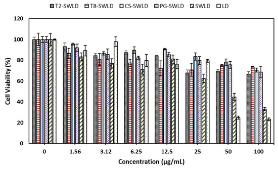Cytotoxicity effect of T2-SWLD, T8-SWLD, CS-SWLD, PG-SWLD, SWLD and LD on 3T3 cell viability determined by MTT assay after 72 h of incubation.
