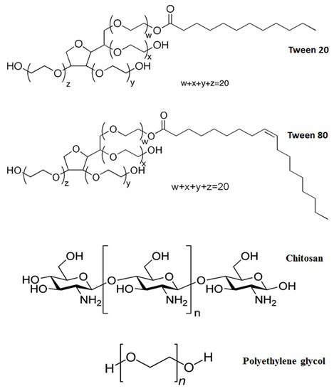 The chemical structures for Tween 20, Tween 80, chitosan and polyethylene glycol.