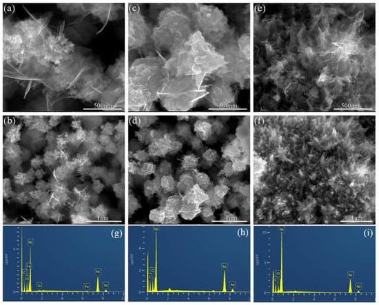 SEM images of the nanoporous Ni obtained with different electroless plating times at 35 °C: (a,b) 3 times; (c,d) 6 times and (e,f) 9 times. EDS spectrums for nanoporous Ni: (g) 3 times; (h) 6 times and (i) 9 times.