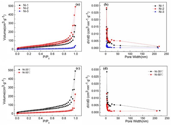 The effects of electroless plating temperature on pore structure of nanoporous Ni were also studied. Figure 4c,d show the nitrogen adsorption-desorption isotherms and pore distribution curves of nanoporous Ni obtained with electroless plating time of 6 times at temperatures of 35 °C and 50 °C, respectively. As shown in Figure 4c, the amount of nitrogen adsorption of Ni-50 °C was much less than that of Ni-35 °C. Noted that the number of mesoporous was also quite a few and almost no macropores existed in sample Ni-50 °C (Figure 4d). It can be concluded from the Table 1 that the specific surface area and total pore volume decreased with the rising of electroless plating temperature. This can probably be attributed to the fact that the rate reaction of nickel ions increased rapidly and the controlled degree of the reaction decreased with the increase of temperature. The nickel particles deposited in the SiO2 framework were more prone to agglomeration at higher temperatures, thereby reducing the number of pores and decreasing the specific surface area of the nanoporous Ni. Hence, the temperature of electroless plating is also a key factor in obtaining nanoporous material with a high surface area.