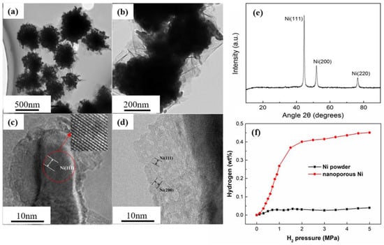 In order to further characterize the structure of nanoporous Ni with the highest specific surface area obtained after electroless plating 6 times at 35 °C, a TEM and HRTEM were used, as shown in Figure 6a–d. Then; the hydrogen storage capacities of the nanoporous Ni were measured by magnetic suspension balance.