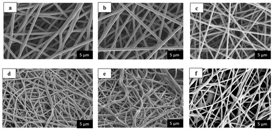 Scanning electron microscopy (SEM) images of WSCHT/PVA nanofibers; (a) 10:90; (b) 15:85; (c) 20:80; (d) 25:75; (e) 30:70 and (f) Crosslinking of CR (c) 20:80.