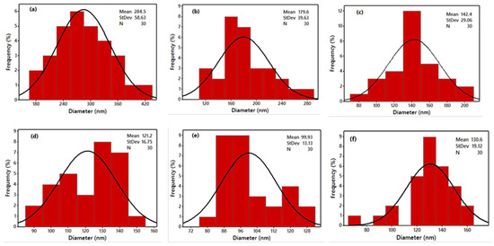Diameter distribution histograms of WSCHT/PVA nanofibers; (a) 10:90; (b) 15:85; (c) 20:80; (d) 25:75; (e) 30:70; and (f) Crosslinking of CR (c) 20:80.