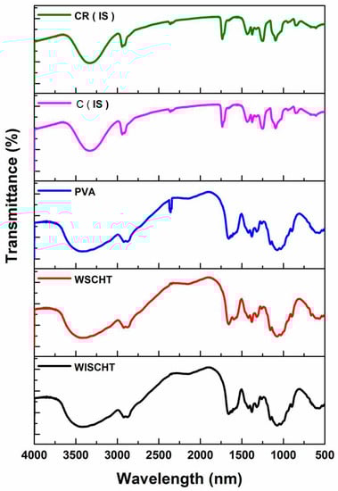 FT-IR spectroscopy is a sensitive and affective technique of detecting the chemical bonds of materials. Figure 4 illustrates the various FT-IR spectra of WISCHT, WSCHT, PVA, C (IS) and CR (IS). In WISCHT, the peak band of approximately 3422 cm−1 is greatly attributed to N–H and O–H stretching vibration. The absorption peak of around 1599 cm−1 relates to the amino groups binding vibrations. Also, a band of carboxyl of around 1654 cm−1 is credited to the acetyl residual. The band range between 896 cm−1 to 1157 cm−1 are part of unique absorb peaks of b-1, 4 glycosides’ bonds found in water insoluble chitosan [44]. When a comparison is done between FT-IR spectrum of water insoluble CHT and that of a water soluble CHT, WSCHT produces a new peak of around 777.5 cm−1 and this is attributed to the decomposition of N=CHCOO− group that results from N=C double bond [45]. This implies that a reaction between the –NH2 of CHT and –CHO of 2,5-anhydro-d-mannose end occurred. Most peaks that relate to acetate groups are revealed in the PVA FT-IR spectrum. Particularly, the broad band of 3200 to 3550 cm−1 is connected to O–H stretch from both intra-molecular and intermolecular bonds of hydrogen. Also, the vibration band recorded in ranges between 2840 cm−1 to 3000 cm−1 results from the C–H stretching from the original alkyl groups and the other peaks that ranges between 1680 cm−1 to 1730 cm−1 are as a result of C–O and C=O stretches that come from acetate groups that remain in the PVA [46].
