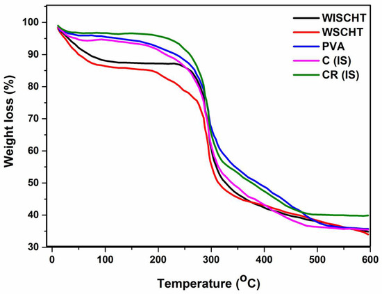 The thermogravimetric analysis (TGA) is a widely used method to investigate the thermal decomposition behaviour of a polymer [49]. The TGA thermograms of WISCHT, WSCHT, PVA, C(IS) and CR(IS), are shown in Figure 5. Figure 5 reveals that WISCHT and WSCHT exhibit a two-step thermal degradation pattern. The first step occurs between 50 °C and 170 °C, which is attributed to loss of the adsorbed and bound water and the second step occurs between 185 °C to 480 °C with polymer degradation and a 55% plus polymer weight loss [50]. WSCHT shows less thermal stability than WISCHT due to the differences of their molecular weight and structure. Prior to degradation, chitosan requires a lot of heat in order to break down complex hydrogen bonds that exist in the molecules. Also, degradation using hydrogen peroxide results in disintegration of both intermolecular and intramolecular interaction and this leads to partial disintegration of molecular structures [51]. The TGA curve of raw PVA shows three zones where mass loss is witnessed and this corresponds to the decomposition its components, which is in agreement with literature [52]. After the first step of water loss, decomposition occurs in the second step of degradation, which commences at 310 °C. At this temperature, 77% of the total mass is lost and this reflects PVA’s chain of decomposition. The subsequent step at 430 °C corresponds to PVA’s major chain degradation. A residue of about 4.5% of the starting mass is observed at 510 °C. The ideal sample of WSCHT/PVA nanofiber exhibited also a three-step degradation pattern. The first step occurs between 50 °C and 120 °C, due to water evaporation. The second and major mass loss is observed between 200 °C and 400 °C, here there is significant degradation of PVA and WSCHT. A smaller mass loss occurs between 450 °C and 550 °C. The cross-linked sample shows the same three degradation pattern with more thermal stability than the uncross-linked (ideal) sample, because of the cross-linking of networks along its macromolecular chain.