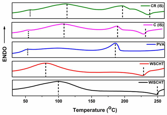 DSC is used to determine the crystallization and thermal parameters of our samples [53]. This technique can be utilized with composite precursors and composites to learn the thermodynamic processes like specific heat capacity and glass transitions, as well as kinetic events that include enthalpic relaxation and cure that is related to stress or physical aging of the polymer. The DSC thermograms of WISCHT, WSCHT, IS, PVA and CR-IS at the heating rate of 10 °C min−1, to a temperature of 250 °C under nitrogen, have been investigated. Figure 6 illustrates the DSC curves produced from all samples. WSCHT and WSCHT produced an endothermic peak; water soluble chitosan exhibited a higher endothermic peak compared to water insoluble chitosan of 50 °C to 150 °C, owing to water vaporization within the polysaccharide backbone. Also, an additional exothermic event is recorded around 230 °C to 250 °C, due to decomposition resulting from the crystalline nature and the reduced weight of the material. In the case of PVA, an extensive endothermic peak is recorded at 54 °C. This is due to release of moisture of the water from the PVA powder. The start of the PVA melting peak is recorded at around 188 °C. Various reports claim that PVA glass transition peaks between 45 °C and 60 °C. Usually, DSC thermograms of water insoluble chitosan-PVA nanofibers, as represented by IS (ideal sample), portray three different shift peaks; at 180.6 °C, 118 °C and 230.2 °C. This shows that PVA and WSCHT retain their characteristic peaks. Small decreases as well as endothermic broadening melting temperature to 230.2 °C point out that there is a reduction in the degree of the polymer’s crystallinity [54]. It is evident that during electrospinning, the crystalline microstructure of the electrospun fiber underwent better solidification of the stretched chains. After cross-linking, there was an increase in the samples’ melting temperature. This is due to higher molecular orientation of the fiber aggregates. Therefore, the chemical cross-linking technique increases the melting temperature of the polymer.