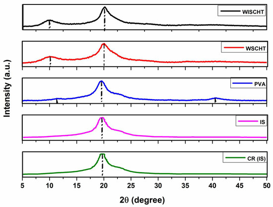 Supramolecular order of materials, also known as crystallinity, is investigated using an X-ray diffraction. Figure 7 shows X-ray diffraction patterns of WSCHT, WISCHT, IS, PVA, and CR(IS). WISCHT and WSCHT show two different peaks at 10–12 °C, as well as a sharp peak at 20–22 °C. In this case, WSCHT exhibits lower peak compared to WISCHT. This is an indication that WSCHT, which is accelerated using hydrogen peroxide, contains a more crystalline structure as compared to WISCHT [55]. The main X-ray diffraction peaks of PVA is at 19.50° and that of minor diffraction at 11.16 °C and 43.30 °C [56]. These peaks show that there are various crystal types in the PVA structure, resulting from high degree of crystallinity. Furthermore, contrary to other powders, the nanofiber sample that is blended with WSCHT-PVA demonstrated a peak at 19.6 °C. The respective peaks of WSCHT-PVA disappeared in the blended nanofiber sample owing it to the strong interaction between PVA and WSCHT. Although both structures of the cross-linked and un-cross-linked samples remained constant, there was a higher intensity and sharpness of the peaks of the cross-linked samples compared to those that were not cross-linked. This difference is due to high crystallinity experienced in those samples that are not cross-linked. The formation of uniform fibers increases when the crystallinity of the sample is higher, as is illustrated in Figure 2. The process of chemical cross-linking through PVA intermolecular interactions with water soluble chitosan are considerable with each of the blended solutions under investigation, in agreement with previous work [57].