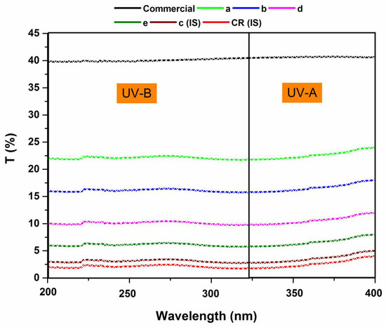 The ultraviolet radiations can be categorized into UV-C (200–280 nm), UV-B (280–315 nm) and UV-A (315–400 nm). Of these radiations, only UV-B and UV-A reach the surface of the earth. UV-C is often absorbed before reaching the earth’s surface by ozone [61] in the stratosphere. Both UV-B and UV-A have positive and negative effects on the environment. For instance, they pose health issues such as skin cancer and immune system suppression. As a result, these health issues have prompted focus on functional fibers that have UV-protective characteristics [62]. In order to find out the ultra-violet blocking attributes of WSCHT/PVA nanofiber mats, the ultra-violet transmission curves of various samples were recorded at room temperature, as illustrated in Figure 9. It is known that 40% of both UV-B and UV-A radiation penetrates commercial samples. The transmittance values of nanofiber samples shows a dramatic decrease indicating that they have high ultra-violet blocking ability, due to superior volume surface to ratio. The results acquired from UV-blocking reveal that an increase in the ratio of water soluble chitosan also increases the UV-blocking efficiency properties. In fact, when ultraviolet transmittance is lower than 5%, the ultraviolet protection of any fabric material is considered as excellent, in agreement with Shahidi and Buzaytoun [63].