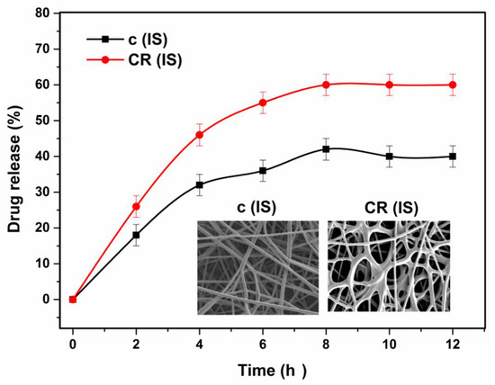 The in vitro drug release study for hesperetin from WSCHT/PVA nanofiber (sample c-IS) and cross-linked sample (CR-IS) was incubated in 10 mL of phosphate buffer solution (PBS) (pH = 7.4) at 37 °C. At various time points, 2 mL of the release medium was removed and followed by diluting to 10 mL using fresh buffer solution. The amount of released hesperetin was determined using the UV-vis spectrophotometer at the wavelength of 288 nm [28].
