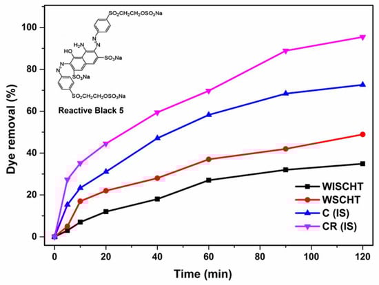The experimental data demonstrates the excellent adsorption ability of C(IS) and CR(IS) over those of WISCHT and WSCHT. There was rapid adsorption within the first five minutes and then the removal rate decreased until it reached equilibrium. Rapid adsorption within the first five minutes happens due to the various vacant adsorption sites on the nanofibers’ surface [69]. From Figure 11, it can be seen that WISCHT exhibited more RB5 removal percentage than WSCHT at 5 min, 30%. There is 70% of RB5 removal in the (ideal) nanofiber sample. The RB5 removal efficiency can reach 95% in the cross-linked (ideal) sample within 120 min, due to the increased number of interaction bonds within the polymer bulk. More active sites on the fiber surfaces are generated when dye is removal, explained by the increased protonation of WSCHT. These protonated amino groups are responsible for creating an ideal environment for high adsorption i.e., the repulsion between the positively charged polymeric chains accelerated the colored liquid transference inside the nanofiber, which attract negative charged dye molecules, this is in agreement of similar findings [70].