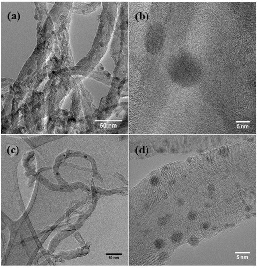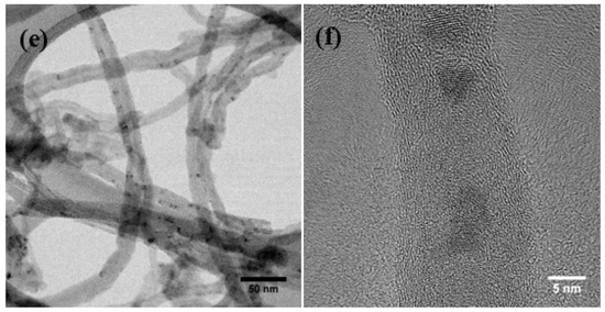 When preparing metallic nanomaterials, achieving a high degree of crystallinity (of the synthesized materials) is essential to extract the desired optical, electronic, and chemical properties [9]. The rate of nucleation during crystal formation on a surface is a strong function of the surface energy as well as the thermodynamic driving force. The former (i.e., the surface energy) is influenced by the surface moieties (e.g., carboxyl groups on crystalline or polymeric [10,11,12] materials), and the latter (i.e., the thermodynamic driving force) [13], which is described as the difference in Gibbs free energy between the crystal phase and the surrounding liquid, is a function of the precursor amount present during synthesis. Thus, the synthesis methods and operating conditions (e.g., temperature [14], reducing agent [15], and precursor amount [13]) are critical elements that need to be adjusted appropriately for the preparation of metal nanocrystals with a high degree of crystallinity [14] and a desired redox state in the metal species [16]. Calcination can facilitate the preparation of ordered structures, but the feasibility of applying such a high temperature of 500 °C or higher can be limited when carbon nanotubes are involved in the mix [6,17]. The chemical attachment of metallic nanocrystals can facilitate MWNT oxidation and lower the MWNT oxidation temperature via the chemical modification of the MWNT surface. [6] However, such processes are conducive to oxide formation; hence, synthesizing zero-valent nanocrystals can be challenging.