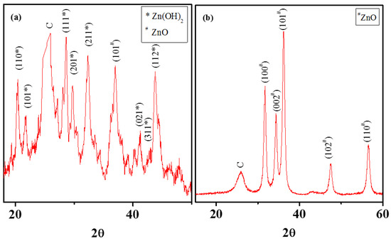 Representative XRD spectra of MWNT–ZnO NH (a) before and (b) after calcination at 400 °C for 3 h. The peak positions are labeled to indicate the respective crystal planes. The XRD spectra were collected at a scanning rate of 2°/min.