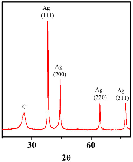 MWNT surfaces have successfully been enhanced with zero-valent Ag (with SEP of +0.799) crystals, employing the modified sol-gel method. It is noteworthy that no additional reducing agent was required for this synthesis. The XRD spectrum of the MWNT-Ag NH (Figure 3) shows defined peaks at (111), (200), (220), and (311) crystal planes, which correspond to zero-valent Ag [61]. Earlier studies on large-scale MWNT-Ag synthesis though report high quantity of Ag-attachment to MWNTs, the XRD spectrum show less-defined peaks, compared to the results presented in this study [46]. Though this study formed Ag-crystals on poly(acrylic acid)-modified MWNT surfaces, thus the underlying mechanism of these nanocrystal growth is likely quite different compared to those grown on oxidized carbon surfaces.