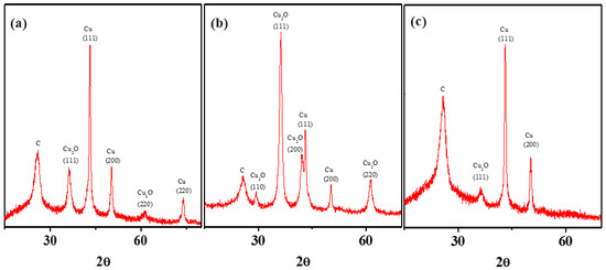 XRD spectrum of MWNT–Cu/Cu2O NH synthesized using the sol-gel process (a) in isopropanol, (b) in oxygen-free conditions with isopropanol, and (c) in dimethylformamide (DMF). An airtight XRD sample holder was used for XRD analysis for all the three materials. The peak positions are labeled to indicate the respective crystal planes. The XRD spectra were collected at a scanning rate of 2°/min.