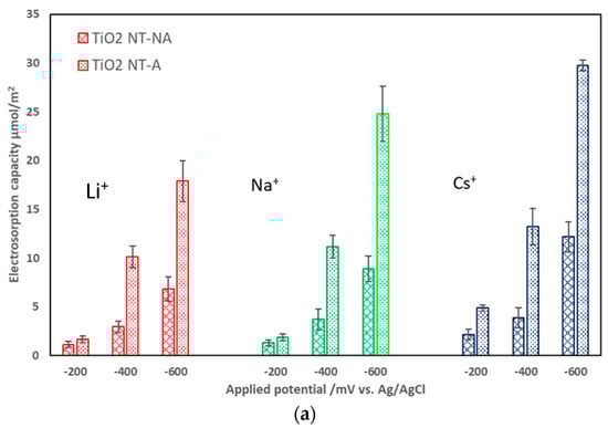Electrosorption capacity of Li+, Na+, and Cs+ (a) at various applied potentials; and (b) for different electrodes (red bars for TiO2 NT-NA and blue bars for TiO2 NT-A).