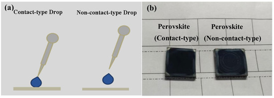 Schematic illustrations for drop method and picture of perovskite films: (a) Schematic illustrations for contact-type method and non-contact-type method to drop MAI solution; (b) Picture of perovskite films dropped by contact-type method and non-contact-type method.