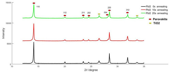 In order to explore the effect of the annealing time of PbI2 thin film on properties of corresponding perovskite thin film, we annealed PbI2 film at 70 °C for 0 s, 10 s, and 20 s, respectively. We found that the 0 s annealing PbI2 film was more conducive to the formation of high-class perovskite films in our experiment, which means that the sequential deposition route through LLLD is more conducive to the formation of qualified perovskite multi-crystalline films. In addition, we adopted a contact-type drop method to drop MAI solution in order to reduce the damage of MAI solution to PbI2 thin liquid film (illustrated in Figure 1).