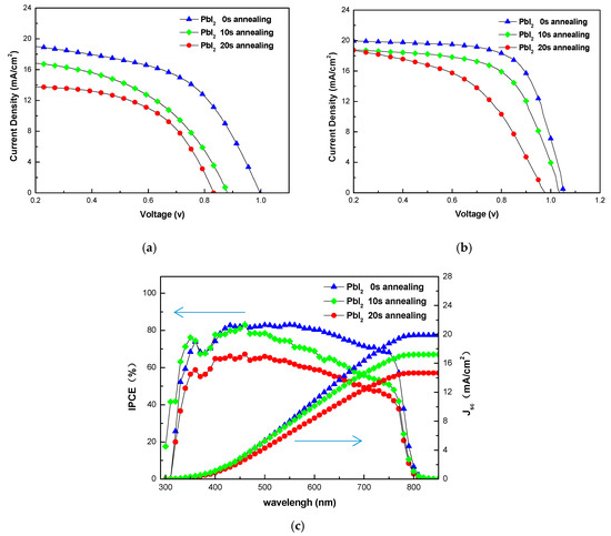 Figure 5a,b show the light current-voltage (J-V) curves from reverse scan (RS) for the devices with a carbon/FTO composite electrode and gold electrode, measured under simulated sunlight with an intensity of 100 mW/cm2 (AM 1.5 G). According to the J-V curve, it is found that the device (corresponding to PbI2 0 s annealing) via the modified sequential deposition route through LLLD showed the best performance in major parameters (such as Voc, Jsc and PCE, and their detailed values can be seen in Table 1) and the others showed obvious attenuation in major parameters. To be sure of the efficacy of our new coating processes and the reliability of current density data, we measured the IPCE of the devices with a carbon/FTO composite electrode, and the results are shown in Figure 5c. Generally, the device performance is increased with the decrease of PbI2 annealing times, indicating that the sequential deposition route through LLLD is more conducive to the formation of qualified perovskite multi-crystalline films under dry ambient conditions.