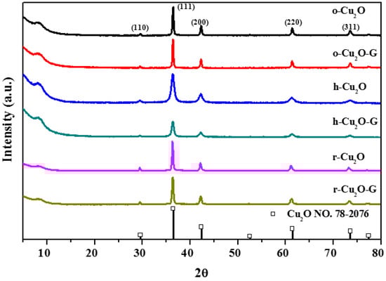 As displayed in Figure 1, the XRD patterns of various shapes of Cu2O- and Cu2O-incorporated graphene samples possess five characteristic reflections at 2θ = 29.6°, 36.4°, 42.3°, 61.4° and 73.6° which are attributed to the (110), (111), (200), (220), (311) planes of cuprous oxide. This result shows the synthesized samples are classified to the cubic phase Cu2O (JCPDS No. 78-2076). The sharp diffraction peaks indicate that the high crystallinity of Cu2O with different morphologies in all samples can be prepared by using wet-chemical methods. In the previous study [27], the intensity of the (220) peak to that of the (200) peak (I(220)/I(200)) is able to be used to evaluate the degree of crystal structure. For instance, the index of I(220)/I(200) is nearly 0.79 in terms of rhombic dodecahedra Cu2O. As can be seen in Figure 1, while incorporating graphene onto various crystals of Cu2O (o-Cu2O-G, h-Cu2O-G and r-Cu2O-G), the value of I(220)/I(200) is practically unchanged, indicating that no apparent perturbation of crystal structure is observed. This result implies that the introduction of graphene may cause little impact on the growth of nanocrystal Cu2O in the samples.